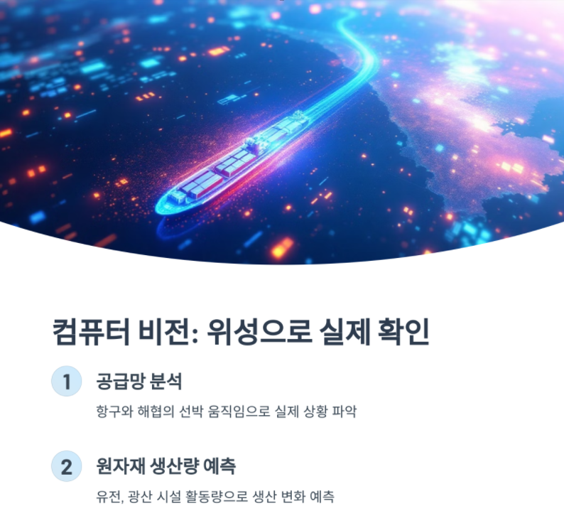 - 공급망 분석: AI는 특정 항구나 해협(예: 호르무즈 해협)을 지나는 유조선이나 컨테이너선의 수, 이동 속도 등을 위성사진으로 분석합니다. 만약 선박의 수가 급격히 줄어든다면, 이는 뉴스보다 먼저 실제 글로벌 공급망에 문제가 생겼다는 강력한 신호가 됩니다.