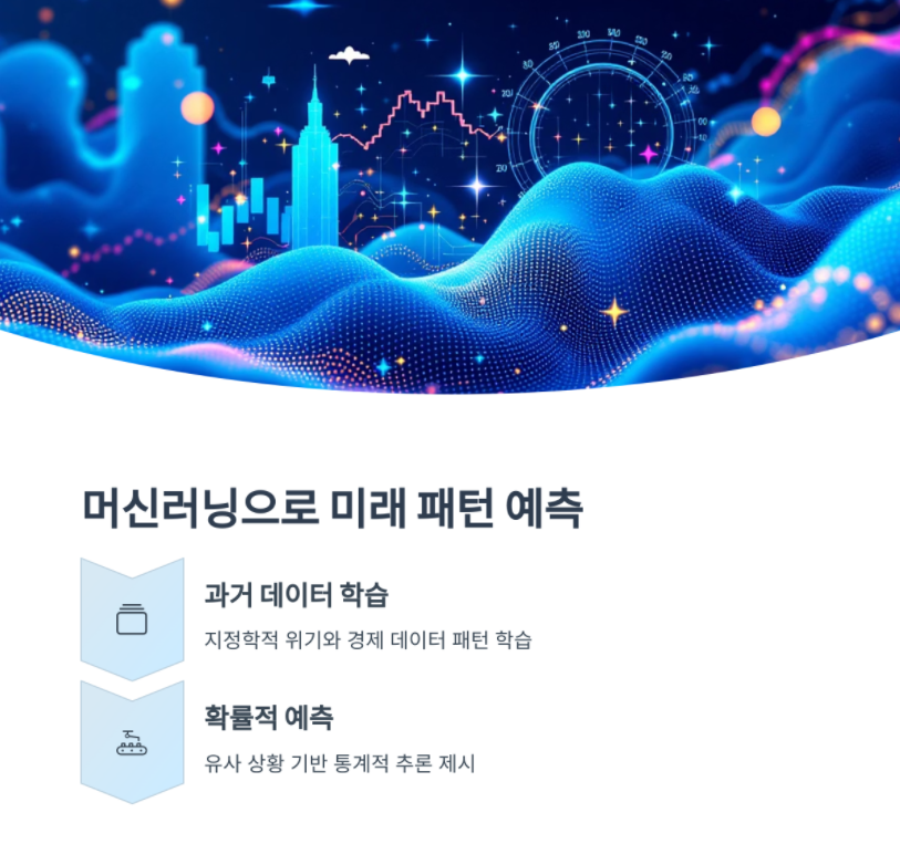 AI는 과거에 발생했던 수많은 지정학적 위기(전쟁, 분쟁 등)와 그때마다의 경제 데이터(주가, 유가, 환율 등)를 학습합니다. 그리고 이 학습을 통해 특정 패턴을 발견해냅니다.