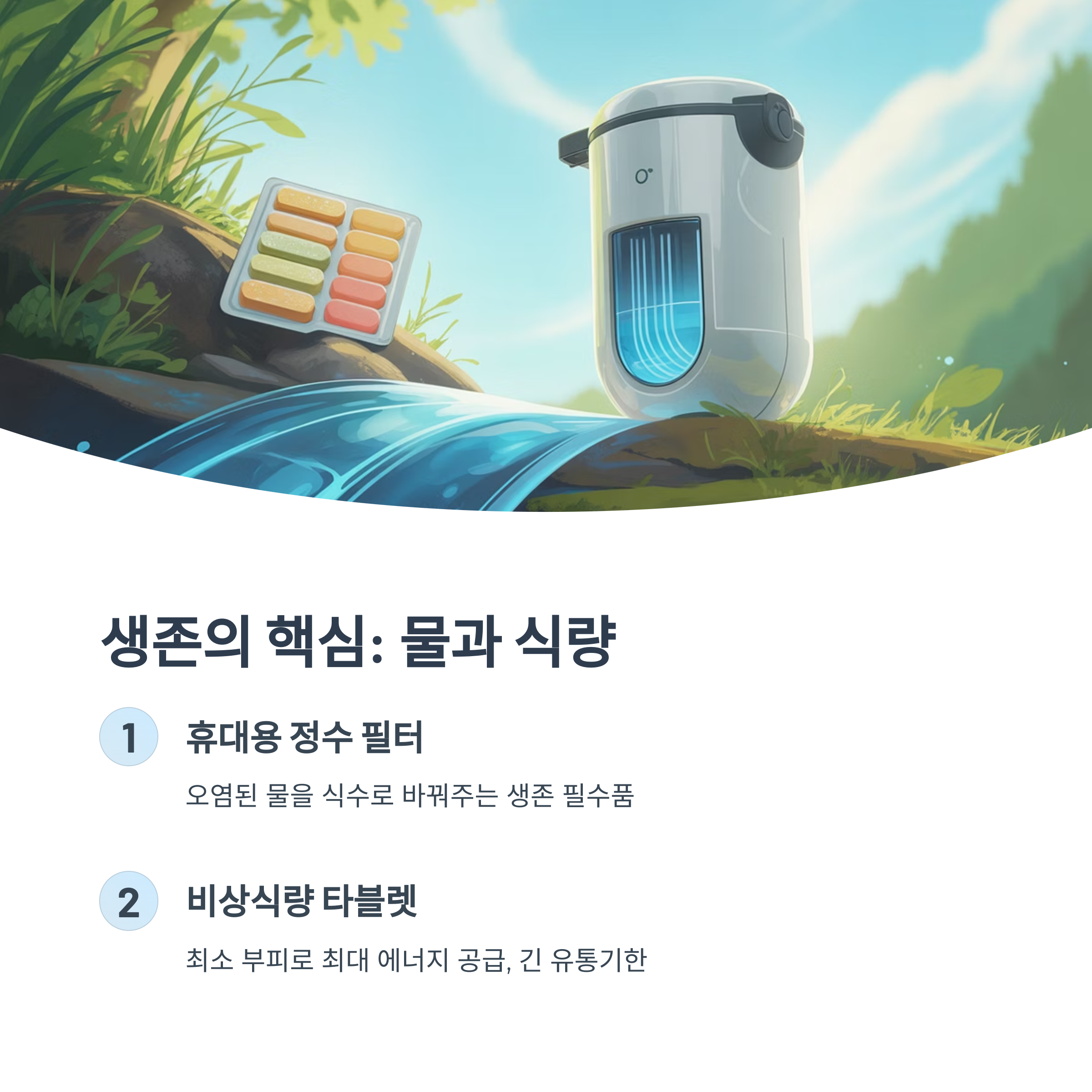 - 1. 휴대용 정수 필터: AI 분석 결과, 재난 시 가장 먼저 끊기는 것은 상수도 시스템입니다. 휴대용 정수 필터는 강물이나 빗물 등 오염된 물을 정수하여 식수로 바꿔주는, 생존 확률을 극적으로 높이는 핵심 아이템입니다.